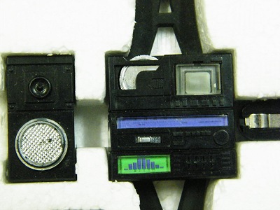 Curieuse montre à quartz LCD et radio AM Ceji. Ensemble modulaire avec HP, élément solaire, ... Etat neuf en boîte.