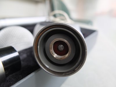 Excellent micro électrodynamique de studio Uher M942 en superbe état et coffret d'origine. Connectique DIN, livré avec 2 capsules 200 Ohms, omnidirectionnelle et cardioïde, bonnette et rallonge de pied télescopique. Un must !