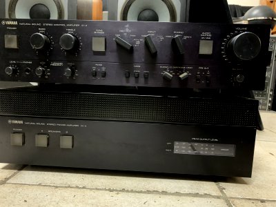 Très bel ensemble ampli/préampli Yamaha C-4 & M-4 de 1980, 2 x 120 W sous 8 Ohms et 18,5 kg pour l'ampli. Seront livrés révisés et garantis. L'ampli M-4 est une petite merveille, avec une belle puissance en réserve.