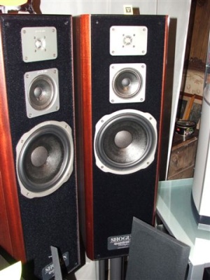 PAIRE D'ENCEINTES QUADRAL SHOGUN TROIS VOIX, FINITION ACAJOU, DOUBLE BORNIER, SALADIERS DES HP EN MATERIAUX LEGERS, FINITION EXEMPLAIRE.