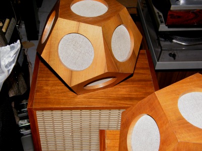 Exceptionnelles enceintes Grundig Box V des années 60. Très belle ébénisterie. Caissons grave/médium sur pieds avec décompression, équipés d'un 30 cm Alnico et d'un medium elliptique Grundig. Boules à facettes équipées de 9 tweeters Grundig. A utiliser avec un bel ampli à lampes de même époque. Extrèmement rares.